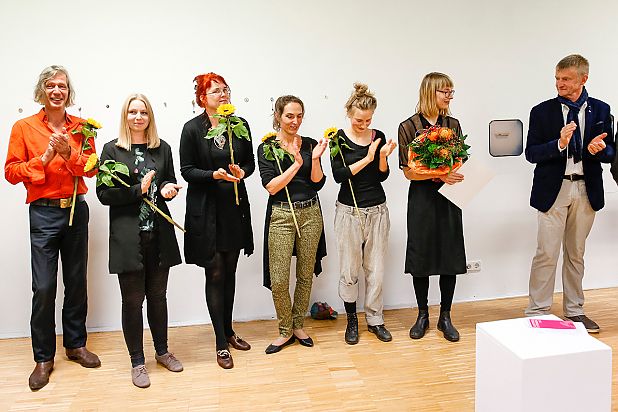 Höhepunkt des Samstagabends war die Verleihung eines mit 1.000€ dotierten Nachwuchsförderpreises, den der Kunstpreis Ottersberg in diesem Jahr anlässlich des 50-jährigen Jubiläums exklusiv für Studierende der HKS ins Leben gerufen hatte. Unter den sechs Nominierten wurde Anne Nitzpan, Studentin der Freien Kunst, ausgezeichnet. Ihre Arbeit mit dem Schaumstoff von Matratzen, überzeugte die Jury. In der Laudatio von Hermanus Westendorp hieß es, Nitzpan habe „das Grundkonzept ihrer künstlerischen Arbeit in unterschiedlichen Materialien und Konstellationen durchgespielt. Es ist ihr dabei gelungen, ein prekäres Gleichgewicht zwischen Idee, Handlung und Material herzustellen“. Lesen Sie dazu auch einen Bericht im Achimer Kurier.