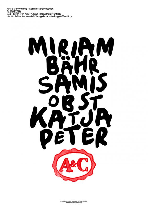 Am Dienstag, den 10. März, finden die Abschlussprüfungen und Präsentationen im Studiengang Arts and Community statt. Es sind alle herzlich willkommen, die künstlerischen Arbeiten zu besichtigen und mit den Künstler:innen ins Gespräch zu kommen.
