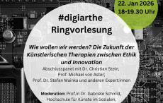Die Arbeitsgruppe #digiarthe veranstaltet ihre finale Vorlesung in der Reihe "Wie wollen wir werden? Die Zukunft der Künstlerischen Therapien zwischen Ethik und Innovation".